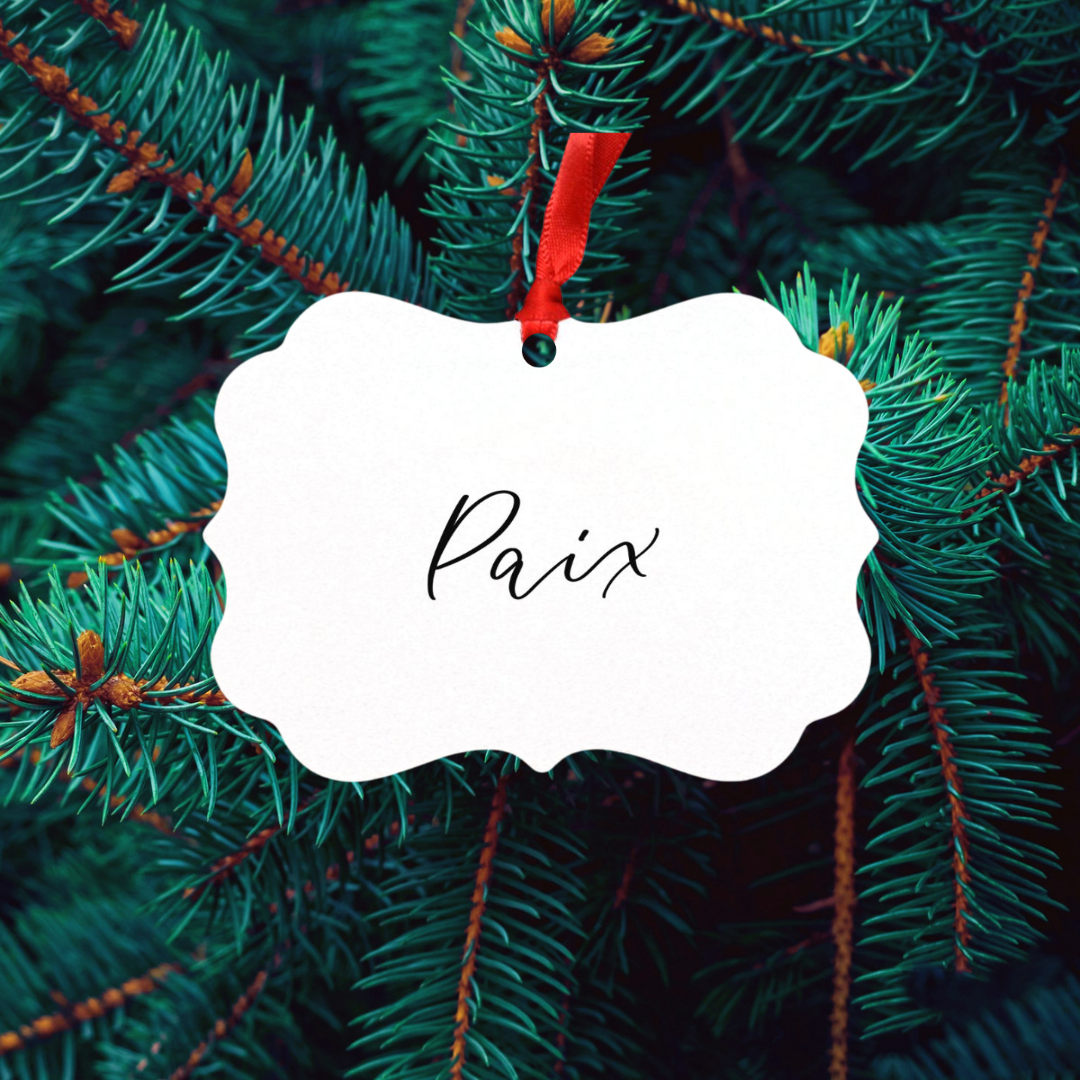 Deck the halls with this charming touch of 'Peace'. This 4″ x 3″ glossy white ornament, accented with a cheerful red satin ribbon, is certain to add a touch of 'Paix' to your holiday decor.